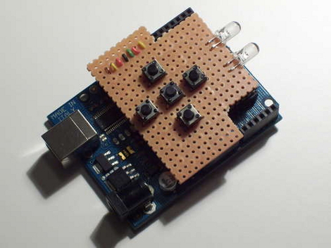 Le projet se présente sous forme d'un shield maison, 5 boutons, 2 LEDs infra-rouges. L'ensemble doit coûter peut-être 1 euro (en dehors de l'Arduino), le tout pourrait même simplement se récupérer d'une vielle télécommande qui traîne dans un carton au grenier.
